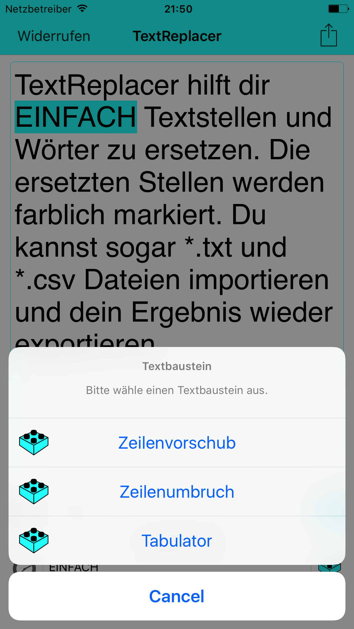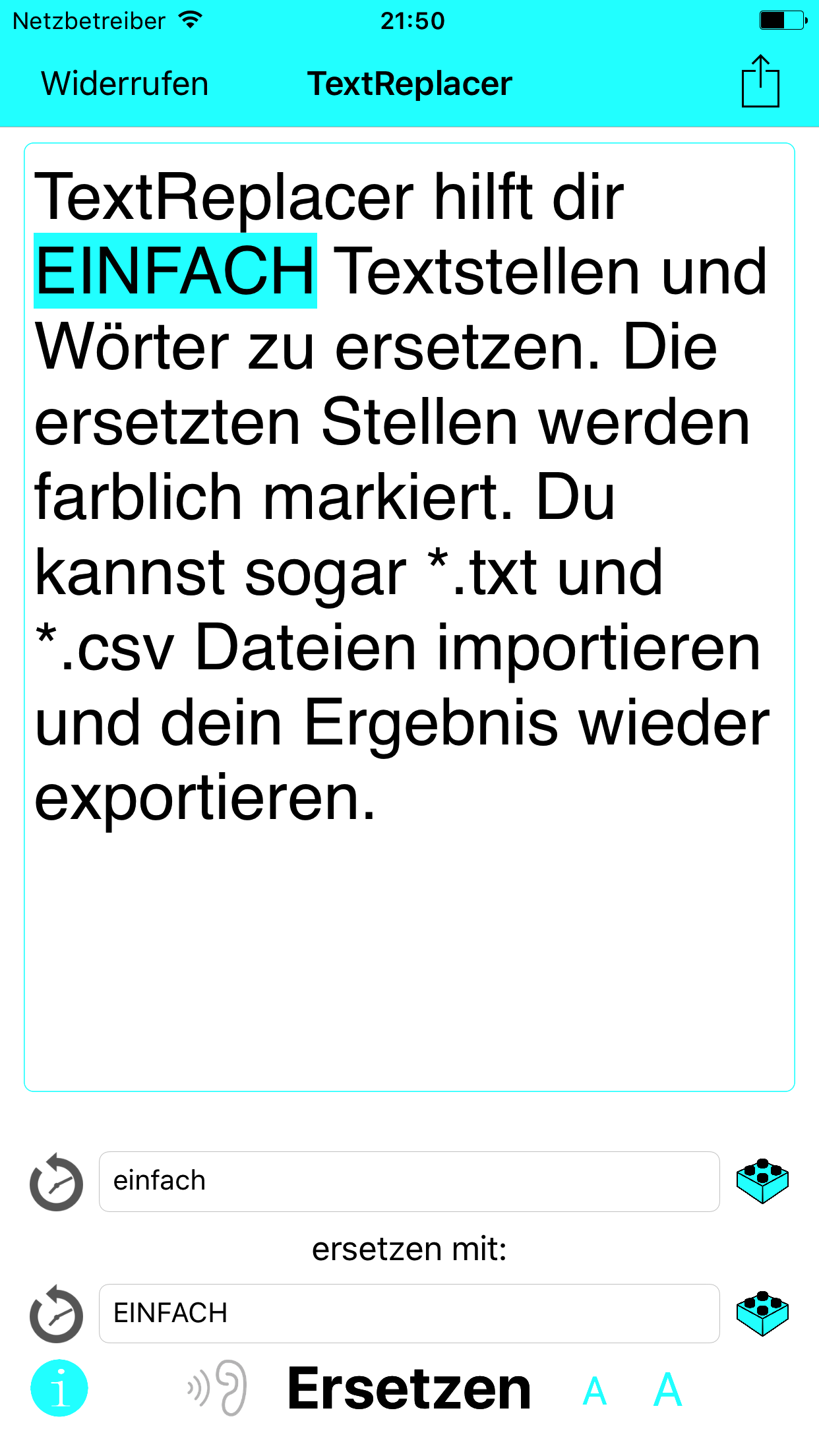 TextReplacer spart dir Zeit, denn er ersetzt für dich alle identischen Textelemente auf einmal und markiert diese für dich damit du sehen kannst wo Teile ersetzt wurden. Du kannst sogar Textbausteine wie Zeilenumbruch, Zeilenvorschub und Tabulator ersetzen. Importiere einfach CSV oder TXT Dateien mit “Öffnen mit…”, füge einen Text aus der Zwischenablage ein oder tippe ihn direkt in der App ein.