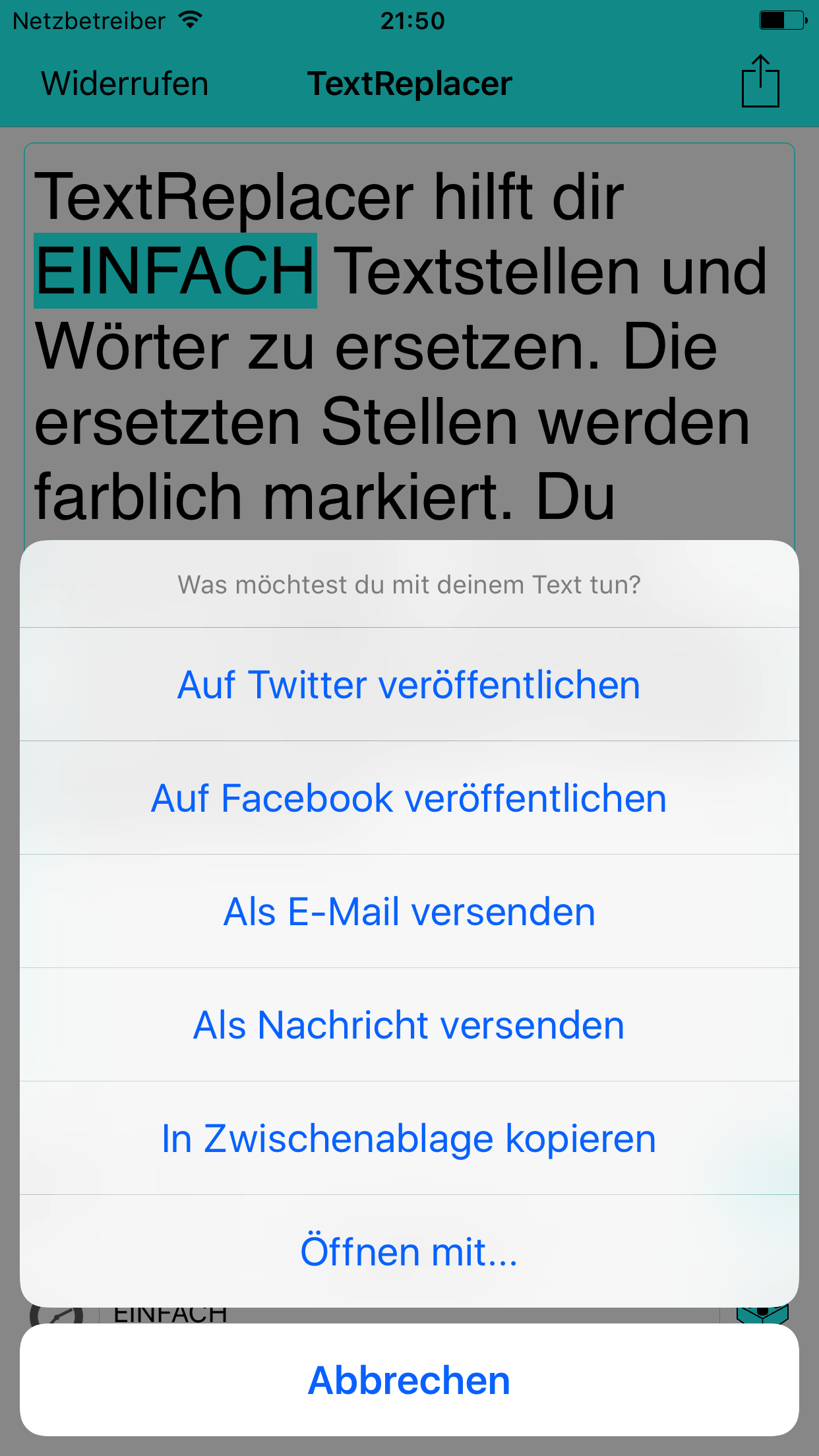 Du kannst jederzeit deinen modifizierten Text als Datei exportieren, per Mail & Nachrichten versenden oder ihn einfach in die Zwischenablage kopieren wenn du möchtest.